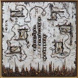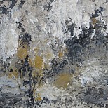 Paardje in een abstracte omgeving, geschilderd op doek. Inspiratiebron: een klein beeldje uit de prehistorie. Acryl, mixed media, structuur.